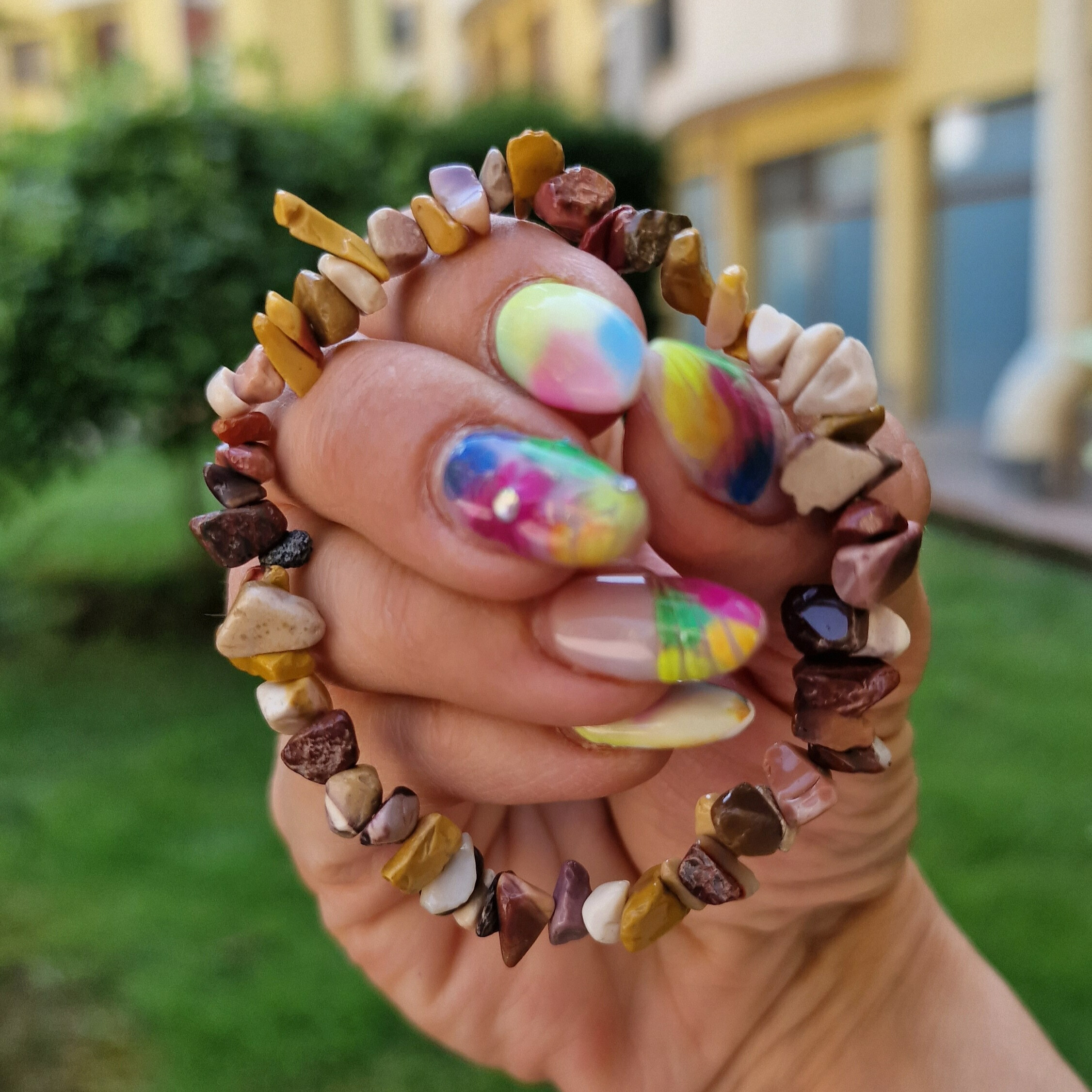 Гривната е изработена от естествени камъни мукаит с неправилна форма, нанизани на ластична корда.