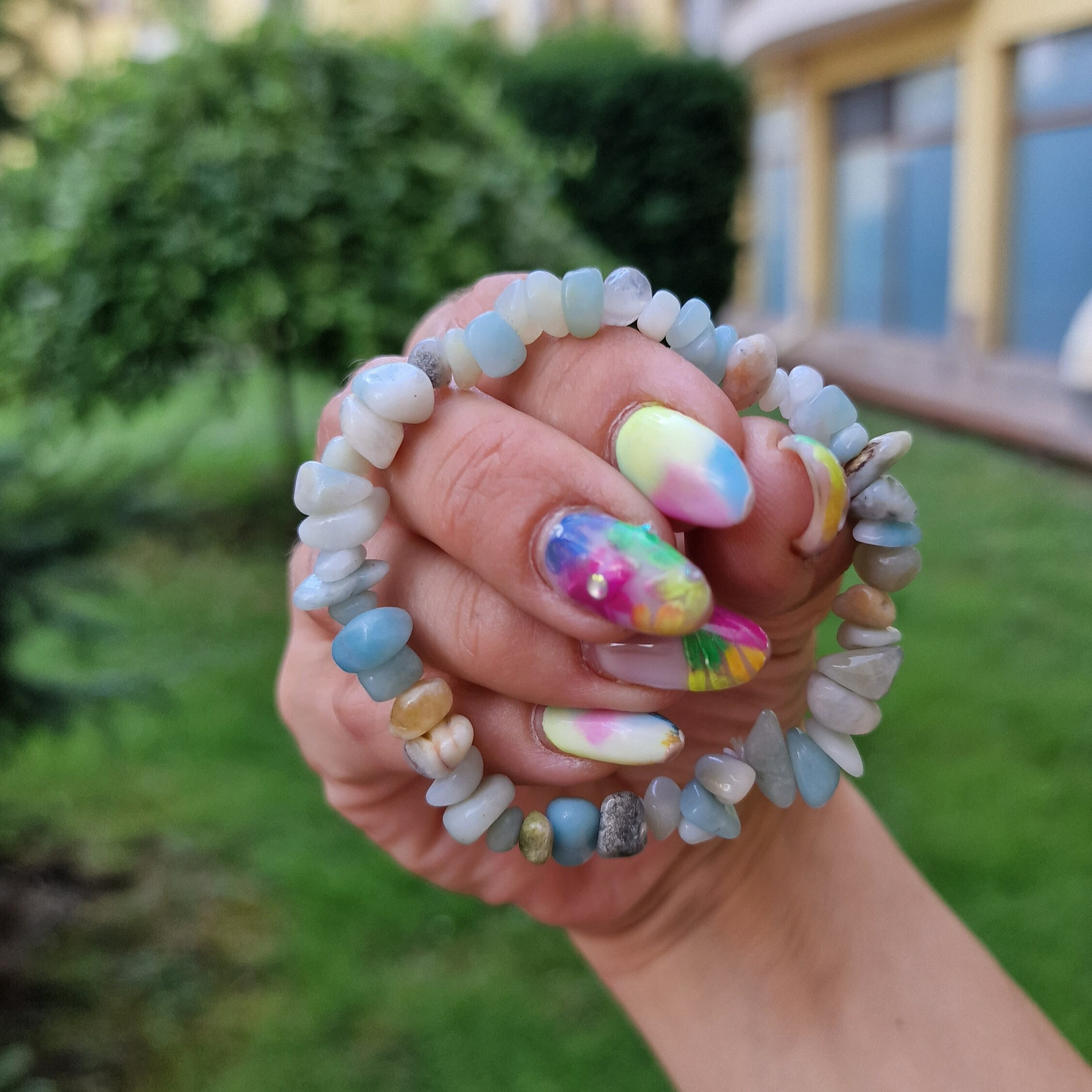 Гривната е изработена от естествени камъни тянхе с неправилна форма, нанизани на ластична корда.