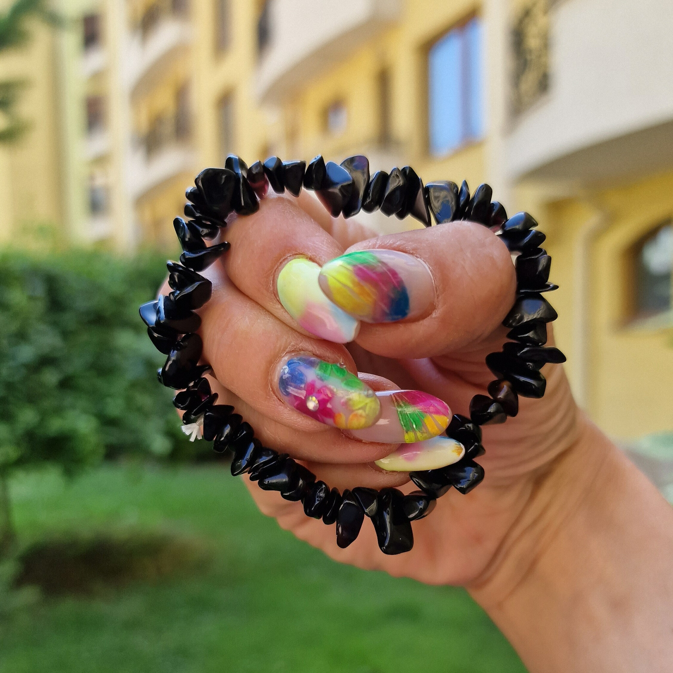 Гривната е изработена от естествени камъни обсидиан с неправилна форма, нанизани на ластична корда.