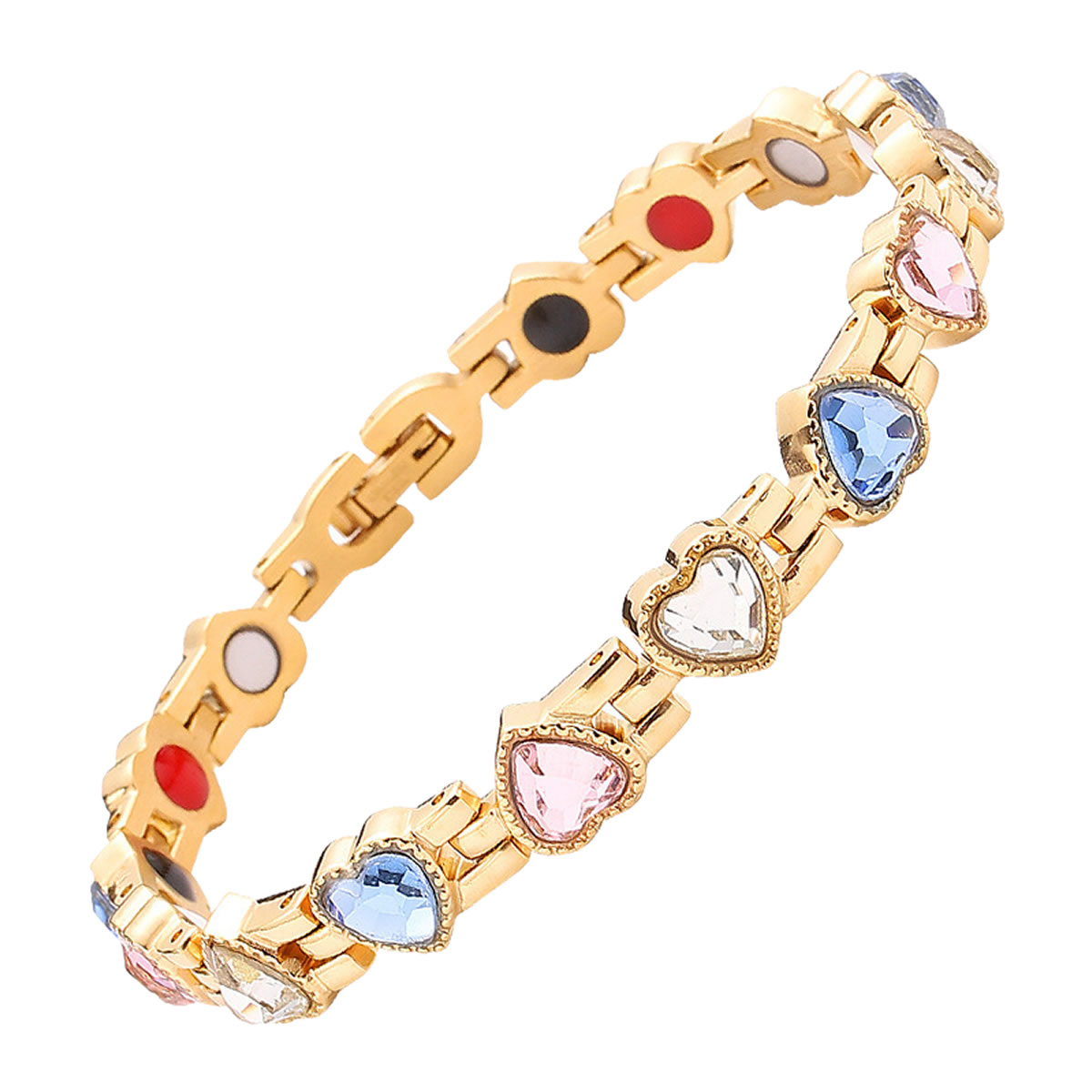 Дамска Златиста магнитна гривна за високо кръвно, "Сърчица с Цветни камъни", Титаниева