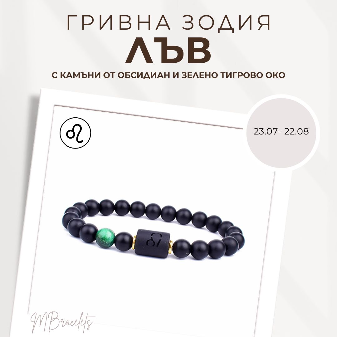 Гривна от Естествени Камъни Обсидиан и Зелено Тигрово око, Зодия Лъв