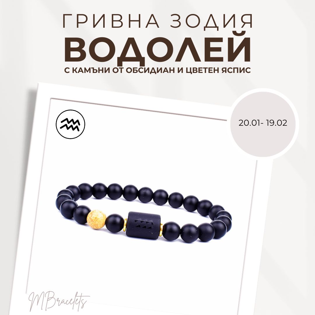 Гривна от Естествени Камъни Обсидиан и Цветен Яспис, Зодия Водолей