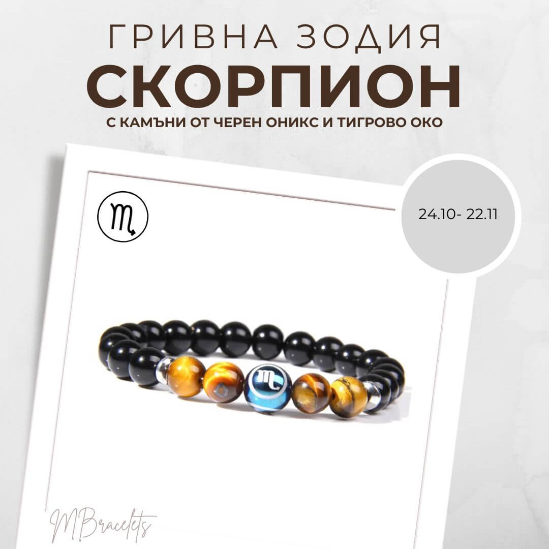 Гривна от Естествени Камъни Черен оникс и Тигрово око, Зодия Скорпион