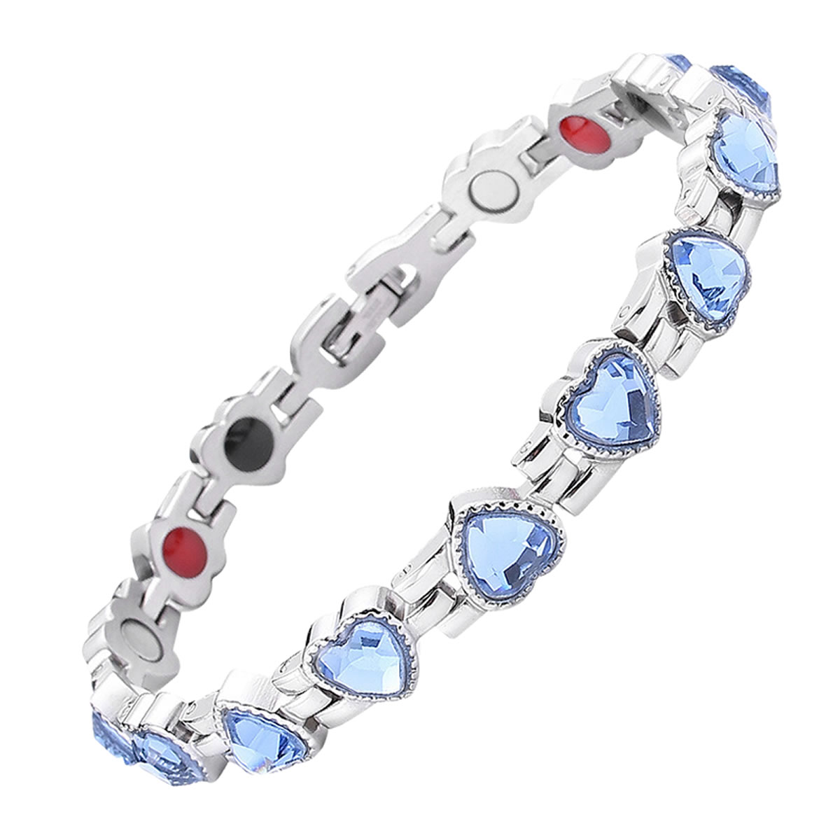 Дамска Магнитна гривна за Високо кръвно "Сърчица със Сини камъни", Титаниева, Сребриста (Код: T-423)