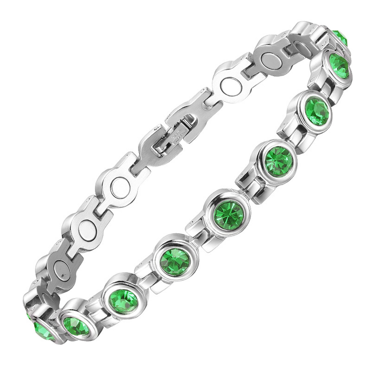 Дамска Титаниева магнитна гривна за високо кръвно, Сребриста със Зелени камъчета